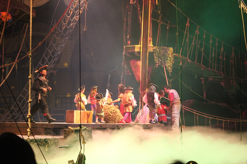 The show is audience interactive. Really neat. You get to cheer on the color pirate of the section you sit in and do "competition" games with the other color pirates. We were in the blue section and got to cheer on the hot blue pirate. ;)